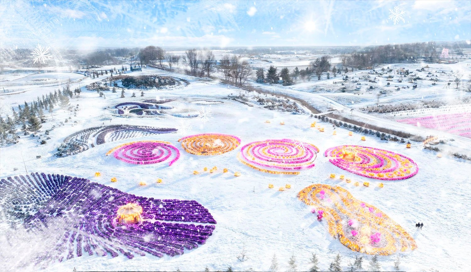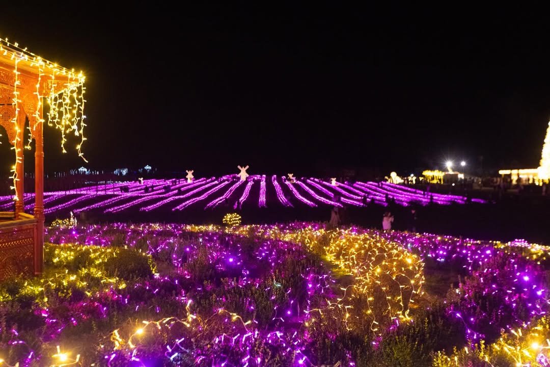 Світловий тунель 200 м сяйва, кришталеві серця, лавандове поле з рожевими гірляндами та сніжинками.