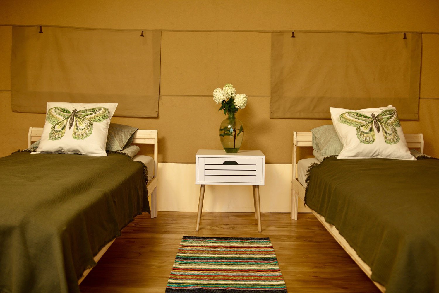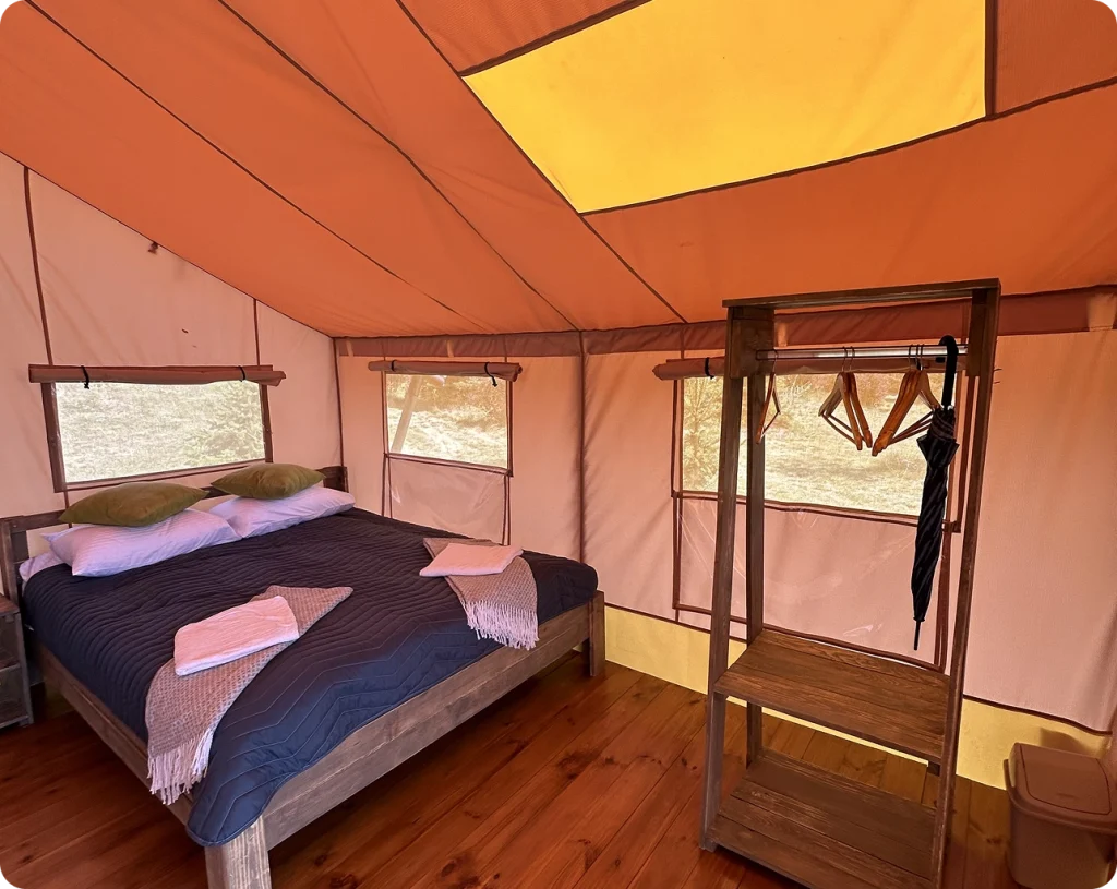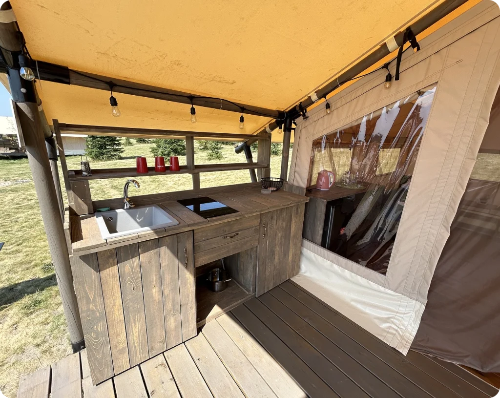 Safari-намети з кухнею — це ідеальний варіант для тих, хто цінує комфорт, але хоче відчути справжню близькість до природи. Проживання у форматі глемпінгу дає змогу насолоджуватись усіма перевагами відпочинку на свіжому повітрі, без втрати зручностей. У наших наметах вас чекає простора спальня зона, окрема кухня з усім необхідним для приготування їжі, зручні меблі та затишна тераса, з якої відкривається мальовничий краєвид на квіткові поля Добропарку.
