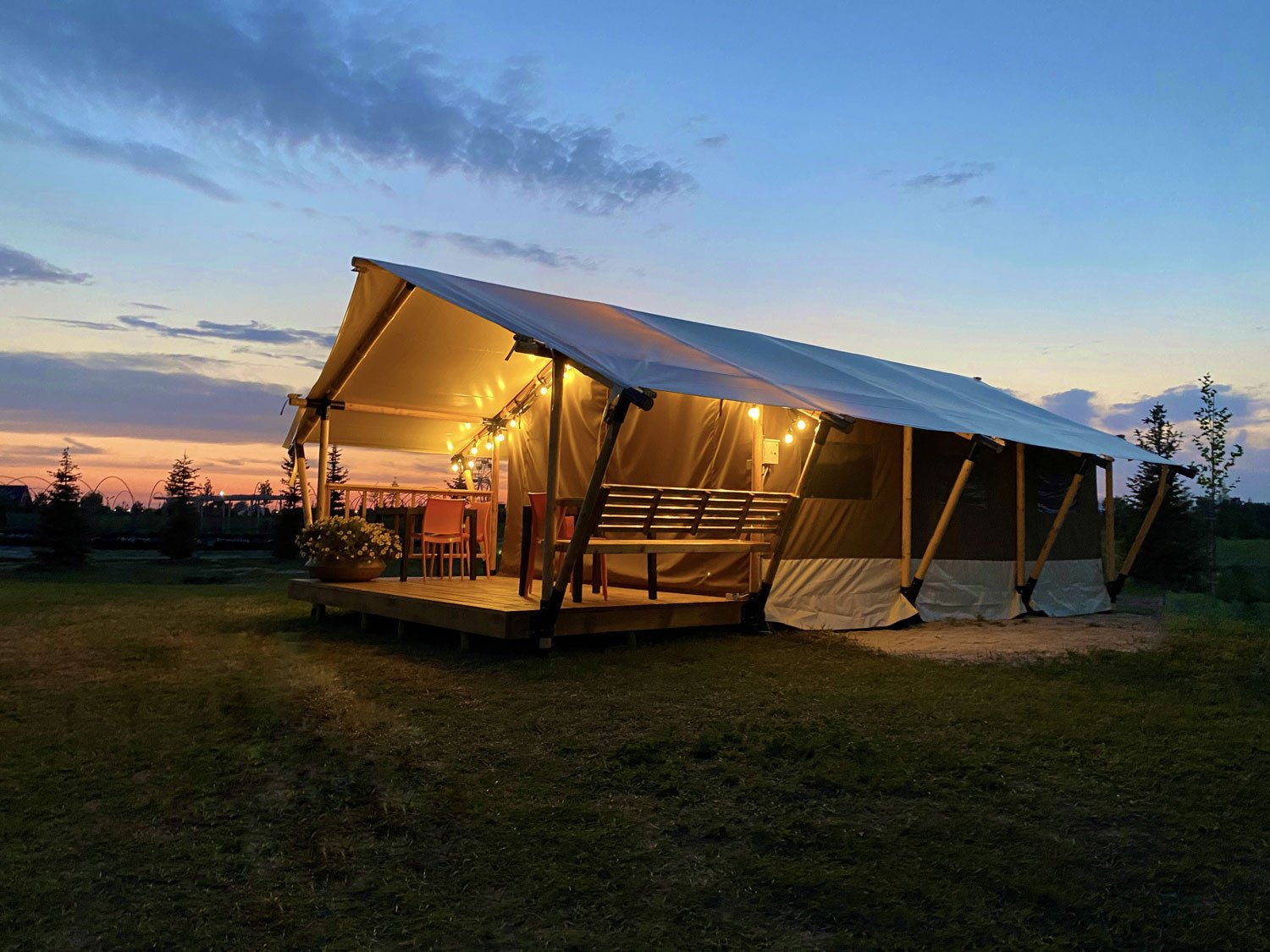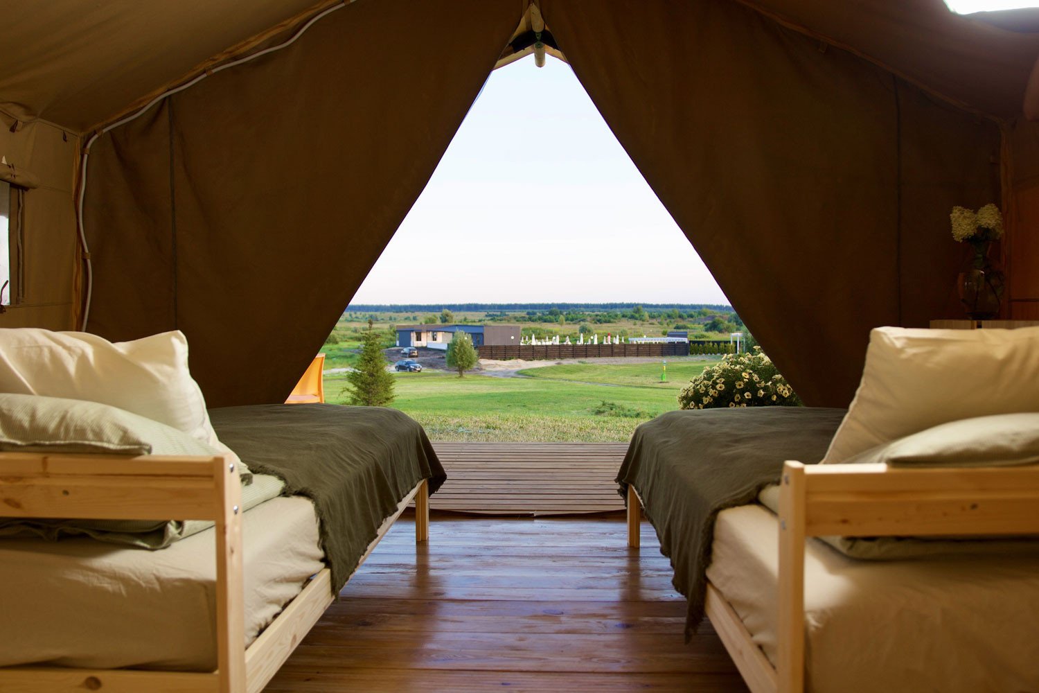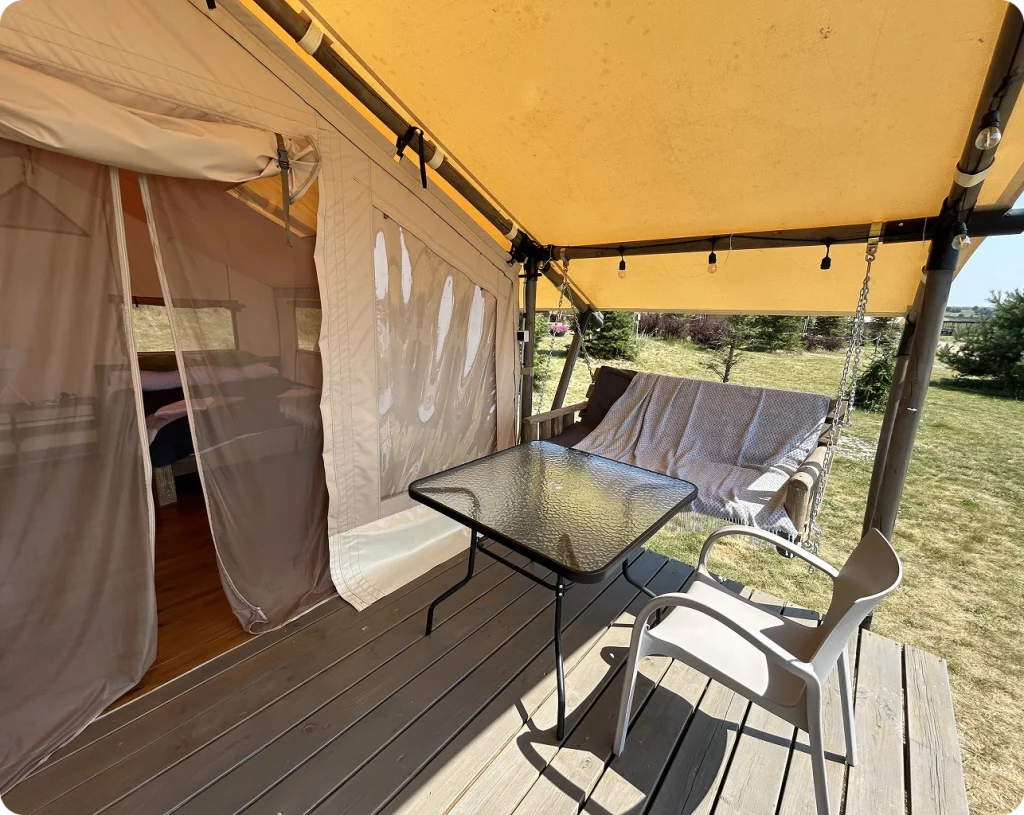 На території парку облаштовані глемпінг-намети, продумані для комфортного перебування на природі. Затишні тераси, панорамні види та близькість до основних локацій Добропарку дозволяють поєднати спокійний відпочинок із прогулянками, басейновим комплексом, фудкортом та іншими форматами дозвілля.