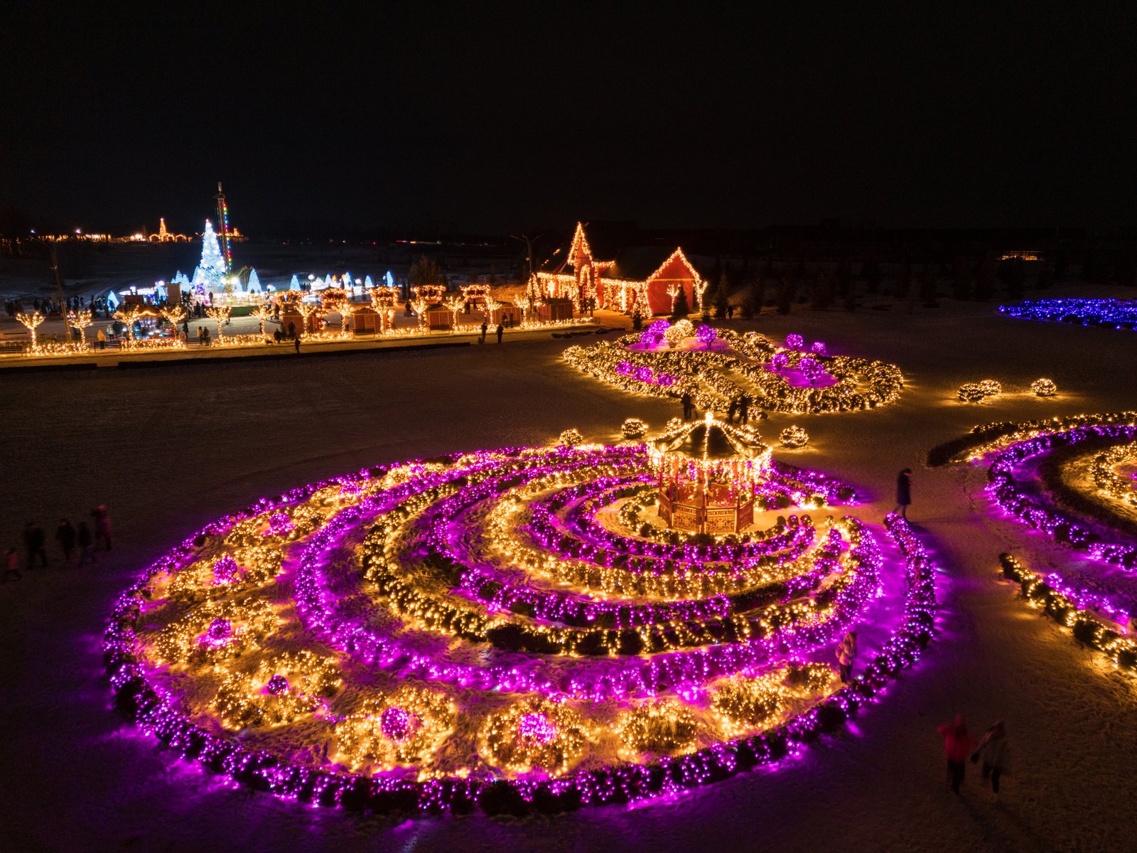 Серед білих ялинок у холодному сяйві гірлянд розташовані п’ять світлових острівців із фігурами пінгвінів і тюленів. З висоти композиція нагадує крижини, що м’яко світяться в темряві.